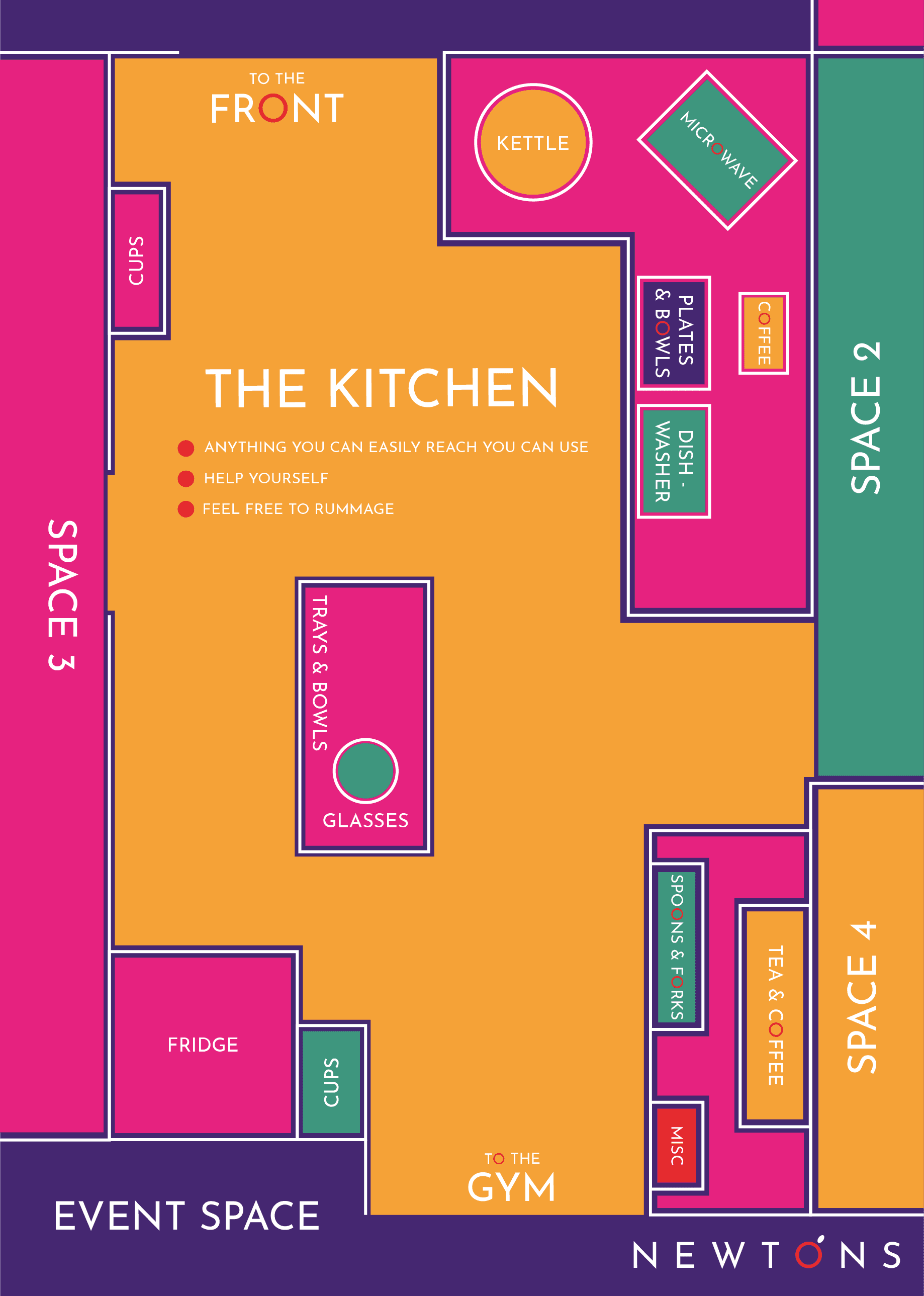 All we ask is that you respect the space, keep it tidy for other coworkers and make full use of the dishwasher (not the sink). If the dishwasher is on, you’ll have to revert to washing up.