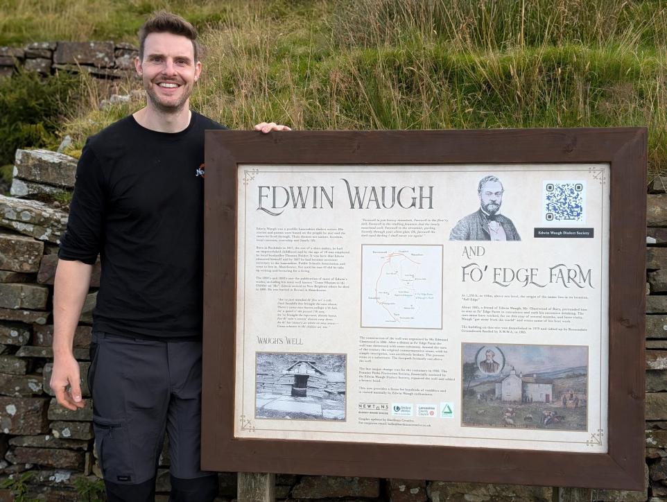 We at Newtons with the ongoing support of the Edwin Waughs Society had the sign redesigned whilst keeping elements of the original sign with the help of community member and graphic designer Dale Hardman. Then over a period of two walks, we took on the 8 mile ramble to remove the old sign, bring it down then take up the new one and fix the refreshed version into place for all to see and enjoy! A little piece of history restored to it’s former glory.